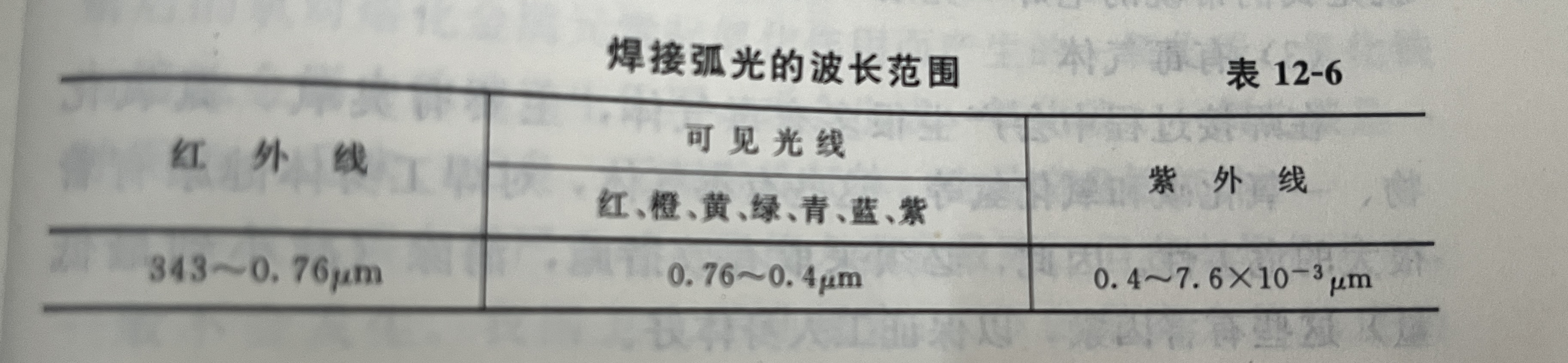 弧光辐射是因为物体的温度高,物体的温度达到1200℃以上时,辐射光谱中即可出现紫外线。随着物体温度增高,紫外线的波长变短,其强度也增大。焊接时,电弧温度高达4000°C以上,并产生弧光辐射,而且是一种很强的弧光辐射。焊接弧光辐射的波长范围见表12-6。