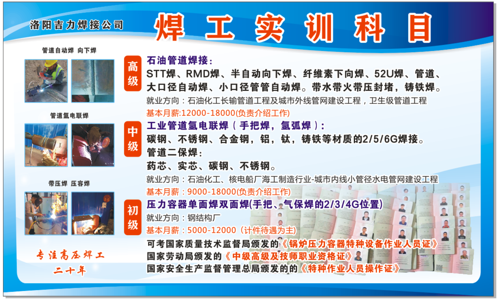学电焊,电焊工培训学校,电焊工证怎么选?来河南吉力电焊工培训学校费用低:管道氩电联学习3800一月(别的学校都6/7千)技术高:学了高级管道下向,管道自动焊毕业分配别的学校做焊培老师(他们都没见过)没有钱:(先学习毕业后交学费)挣钱慢:免费国外安置月薪2万起。考焊工证2周一次,出证快不耽误事!