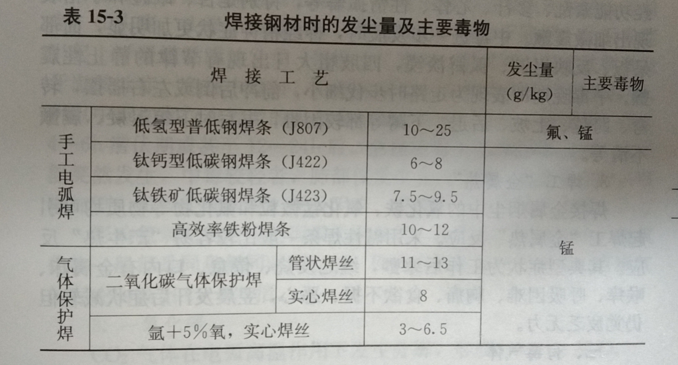 焊接产生尘的成分复杂,不同焊接工艺的烟尘成分及其主要危害也有所不同,例如:黑色金属除料焊条手工电弧,CO2焊、碳弧气刨,镀锌件的焊接以及有色金属气焊时,粉尘是主要的有害因素,粉尘的主要成分是铁、硅,锰,其中以锰的毒性 大,铁硅的毒性然不大,但其粒极组(5m以下),在空气中的停留时间较长,容易吸入肺内,在碱性条的粉尘中还含有极毒的氟。采用铜的气体保护焊时,有毒烟中向有铜,钢材焊接时发尘量及主要毒物见表15-3