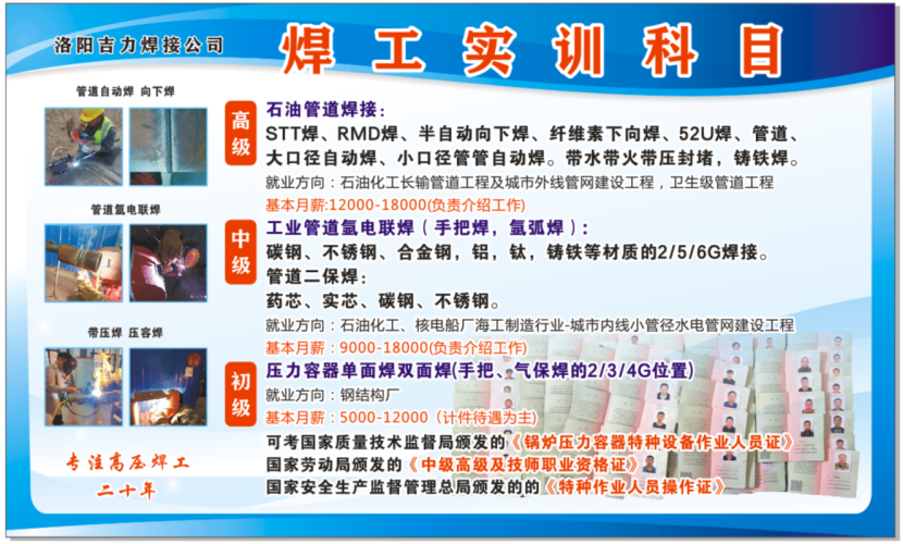 学电焊,电焊工培训学校,电焊工证怎么选?来河南吉力电焊培训学校费用低:管道氩电联学习3800元(别的学校都6/7)技术高:学了高级管道下向,管道自动焊毕业分配别的学校做焊培老师(他们都没见过)没有钱:(先学习毕业后交学费)挣钱慢:免费国外安置月薪2万起。考焊工证一周一次,出证快不耽误事!