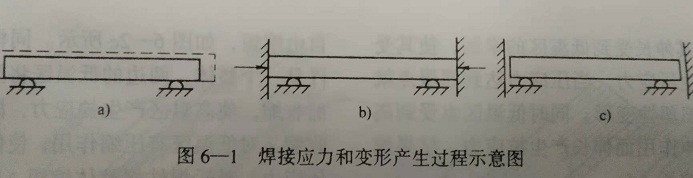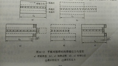 焊接冷却时,由于高温区在加热时产生压缩塑性变形的缘故,若高温区与低温区是可分离的,能自由收缩的,高温区冷却后将自由缩短,如图6-2c所示。同样,由于焊件是一个整体,两边的低温区将阻碍高温区的收缩,使高温区产生拉应力,同时高温区收缩又对低温区有压缩作用,使低温区产生压应力。 后焊件将整体缩短△L’,这就是焊件产生焊接应力与变形的实际情况。