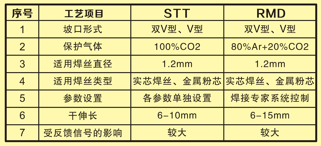 在参数调节上,STT的各个参数(峰值电流、基值电流、送丝速度、提前送气时间、滞后关气时间、电弧回烧时间、热起弧、尾拖)需单独设置;RMD集成了强大的焊接专家系统,规范大小只需设定送丝速度即可,其它参数自动匹配,参数调节更简单,而且软件升级容易,一旦对参数有更好的控制程序,只需输入新程序即可获得更好的焊接效果,无需更换新设备。焊丝的干伸长对焊接效果的影响,STT的干伸长一般控制在6-10mm左右,如太长,焊接较不稳定;RMD的干伸长适应性较好,在6-15mm左右电弧都较稳定。