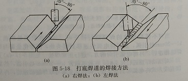 (1)打底焊。打底焊时,如果坡口角度较小,熔化的金属容易流到电弧前面去,而产生未焊透的缺陷。在焊接时可采取右焊法,直线式移动焊枪,见图5-18(a);当坡口角度较大时,应采用左焊法和小幅度摆动焊枪,见图5-18(b)。当采用左焊法时,一般电弧在坡口两侧稍加停留,使熔孔直径比间隙略大0.5~1mm,尽量保持熔孔的直径不变,保证坡口两侧熔合良好。打底焊时要保证焊道两侧与坡口结合处略下凹,焊道表面平整,焊道厚度不要太厚。
