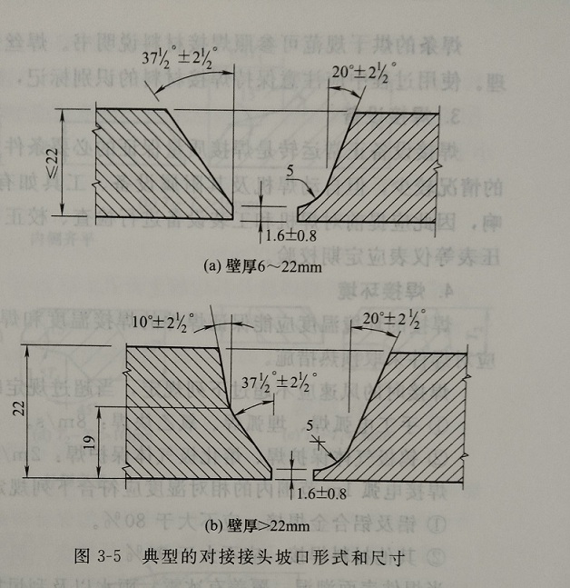 焊接坡口的根本目的是确保接头根部的焊透,并使坡口面熔合良好。选择坡口形式和尺寸应考虑焊缝填充金属尽量少,避免产生缺陷,减少焊接残余应力和变形,减少异种金属焊缝的稀释率,有利于焊接防护,使焊工操作方便等因素,并根据接头形式、焊接位置、焊接方法、有无衬垫及使用条件确定。对于奥氏体不锈钢的焊接,还要注意坡口形式和尺寸对抗腐饨性能的影响,城口形式和尺寸应符合设计文件和焊接工艺指导书(WPg)的规定,典型的对接接头坡口形式和尺寸见图3-5。